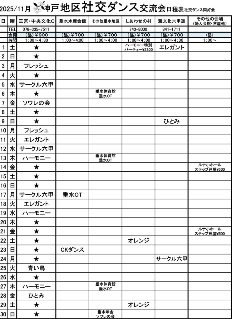 2025年11月 神戸社交ダンス日程表1